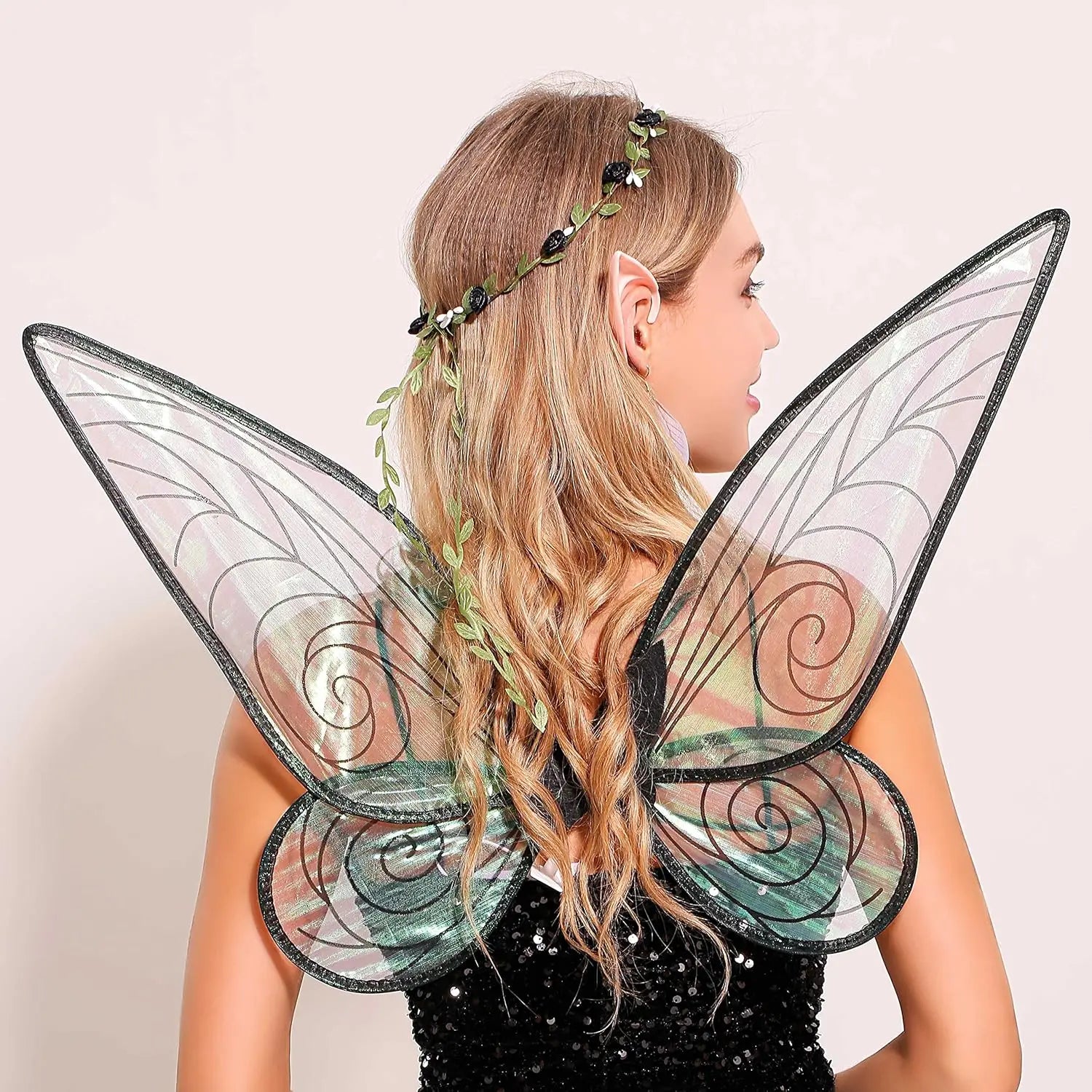 Laventy Sexy Fairy Wings for Adults Black Fairy Wings Costume Women Fairy Elf Ears Floral Headband Crown Fairy Wings Earrings