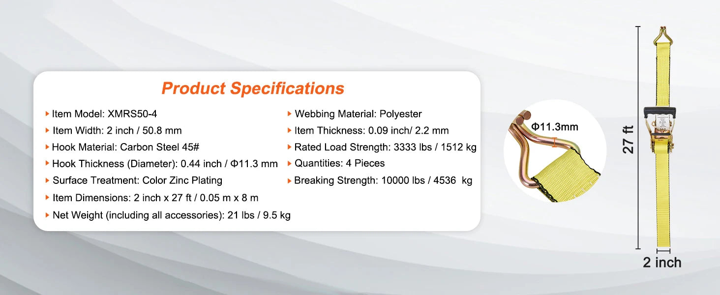 What You Will Get: The ratchet strap set includes a 4-piece 2-inch x 8/15/27-feet kit, axle belt, and velcro tapes, all stored in a durable storage bag that is itself sturdy and long-lasting.
